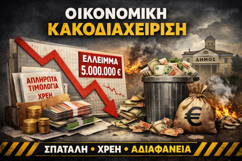 Τα όσα αποτυπώνονται πλέον με σαφήνεια για την οικονομική κατάσταση του Δήμου δεν αφήνουν περιθώρια ωραιοποίησης. Όταν γίνεται λόγος για πρωτογενές έλλειμμα που προσεγγίζει τα 5 εκατομμύρια ευρώ, όταν τα ταμειακά διαθέσιμα εμφανίζονται τεχνητά διογκωμένα λόγω συσσωρευμένων απλήρωτων υποχρεώσεων και όταν βασικές δαπάνες – όπως η διαχείριση απορριμμάτων – υποεκτιμώνται κατά εκατοντάδες χιλιάδες ευρώ, τότε […]